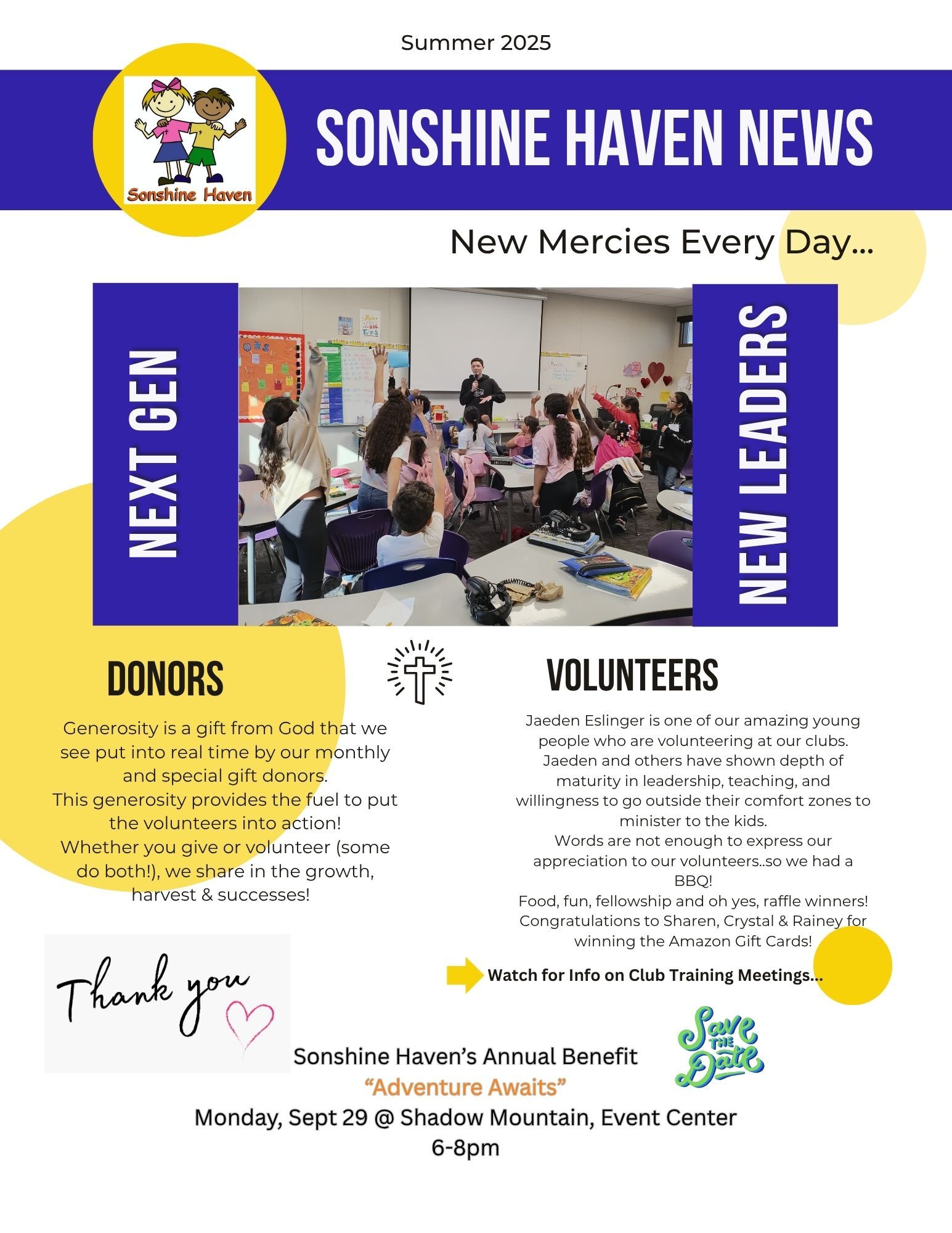 What we offerSonshine Haven provides 500+ elementary and middle school children in 21+ schools in seven school districts in San Diego County with free, faith-based after school clubs. We also offer free Life Skills classes, Thanksgiving-in-a-Box and Christmas Adopt-a-Family to help our club kids and their families in need. We enjoy offering an overnight camp experience to our club kids in the summer at Indian Hills Camp.